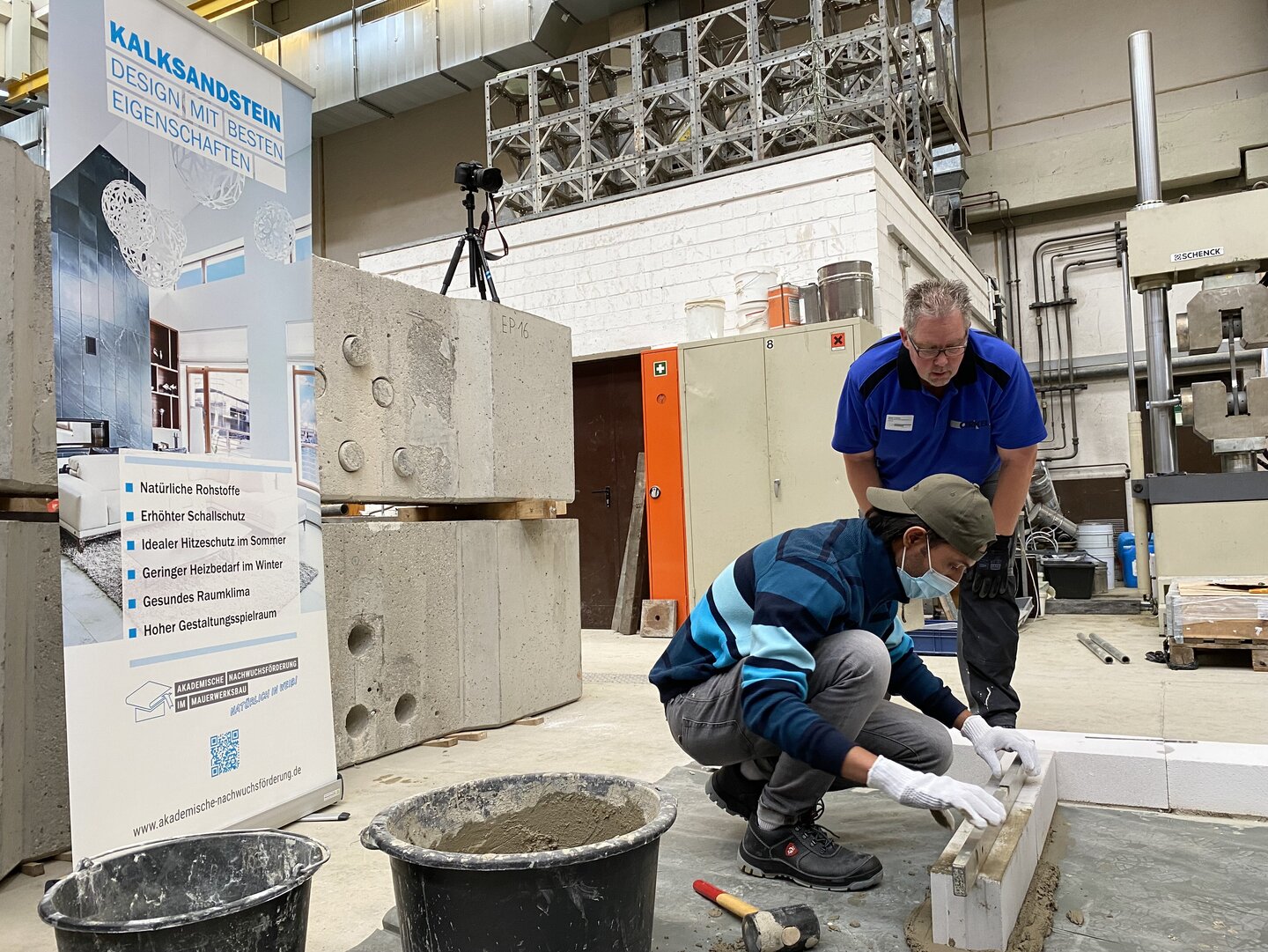 - Ihre Studierenden mauern in vorgegebener Zeit eine einfache Wandkonstruktion aus Kalksandstein und Porenbeton.