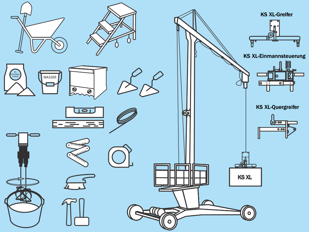Für die Verarbeitung von KS-Steinen und KS-Systemelementen steht eine Vielzahl an Materialien von Mörtel, Putzen, Bewehrungseinlagen und Arbeitshilfen zur Verfügung. Dünnbettmörtel sind mit geeigneten Mörtelschlitten aufzutragen.