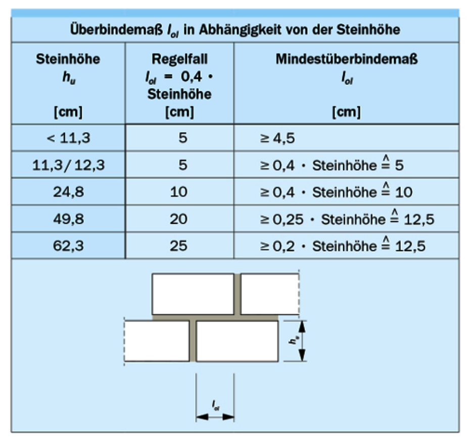 Die Forderung nach der Einhaltung des Überbindemaßes wird durch die Ausführung des Mauerwerks im Verband gewährleistet, wenn die Stoß- und Längsfugen übereinander liegender Schichten mindestens mit dem Überbindemaß lol ≥ 0,4 · hu bzw. lol ≥ 45 mm (der größere Wert ist maßgebend) angeordnet werden.
