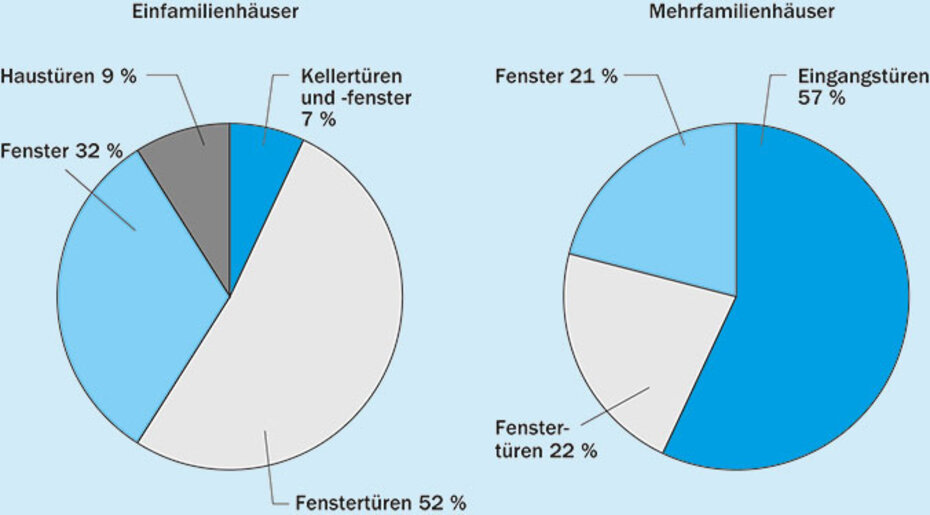 Bei Gewerbetreibenden kann der Schaden eines Einbruchs (Verlust von Daten durch Zerstörung oder Diebstahl ganzer Büroausstattungen inklusive Computer und Servern) den unternehmerischen Ruin bedeuten. Einbrecher haben nur wenige Minuten Zeit, um in das Gebäude zu gelangen. Fenster und Türen sind die bevorzugten Angriffspunkte (Bild 1). Nach fünf Minuten gibt der Einbrecher auf – so lautet das Ergebnis einer wissenschaftlichen Studie von Prof. Dr. Feltes M.A., Lehrstuhl für Kriminologie, Kriminalpolitik und Polizeiwissenschaft an der Ruhr Universität Bochum.