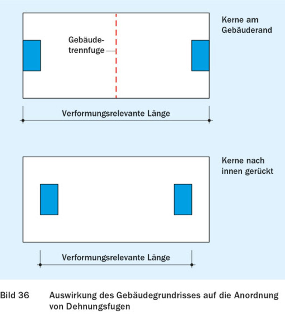 Ausgehend von den Festpunkten (z.B. Aussteifungswänden, Aufzugsschächte und Treppenhäuser) können mit Hilfe von Schwind- und Temperaturkennwerten die zu erwartenden Längenänderungen von Dachdecken und Wänden abgeschätzt werden.