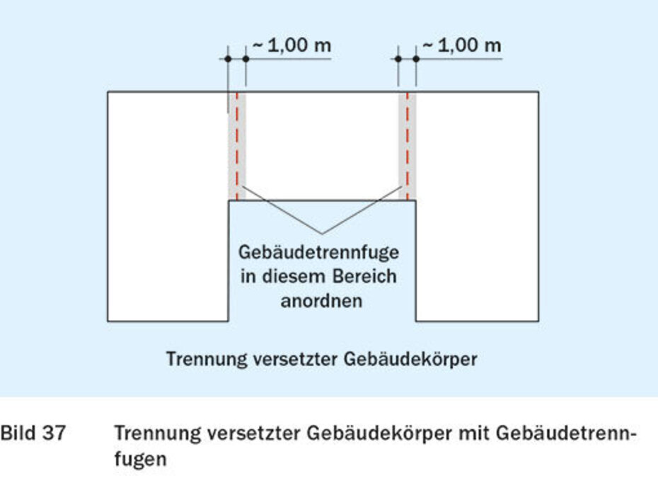 Zu beachten ist, dass bei gegliederten Gebäudeformen (z.B. L-, T- oder Z-förmige Grundrisse) das zu erwartende Rissrisiko infolge der unterschiedlichen Formänderungen im Übergang der einzelnen Gebäudeteile grundsätzlich durch Dehnungsfugen minimiert werden muss. |