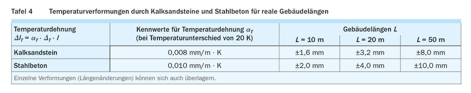 Die zu erwartenden Schwind- und Temperaturverformungen von Kalksandstein-Mauerwerk und Stahlbeton sind in den unteren Tafeln dargestellt. |
